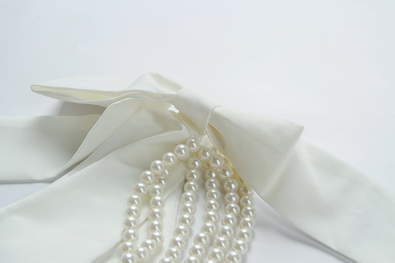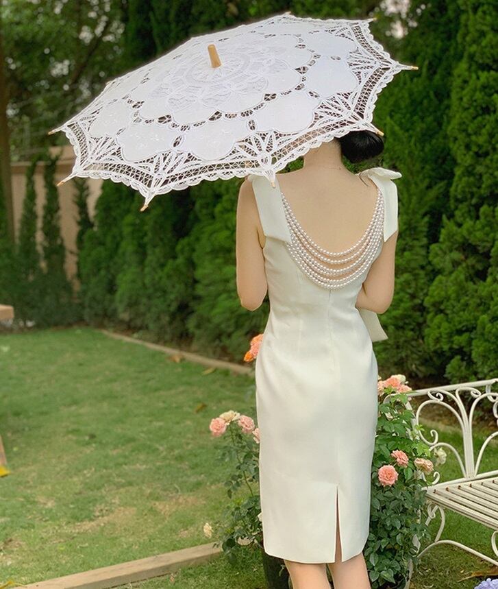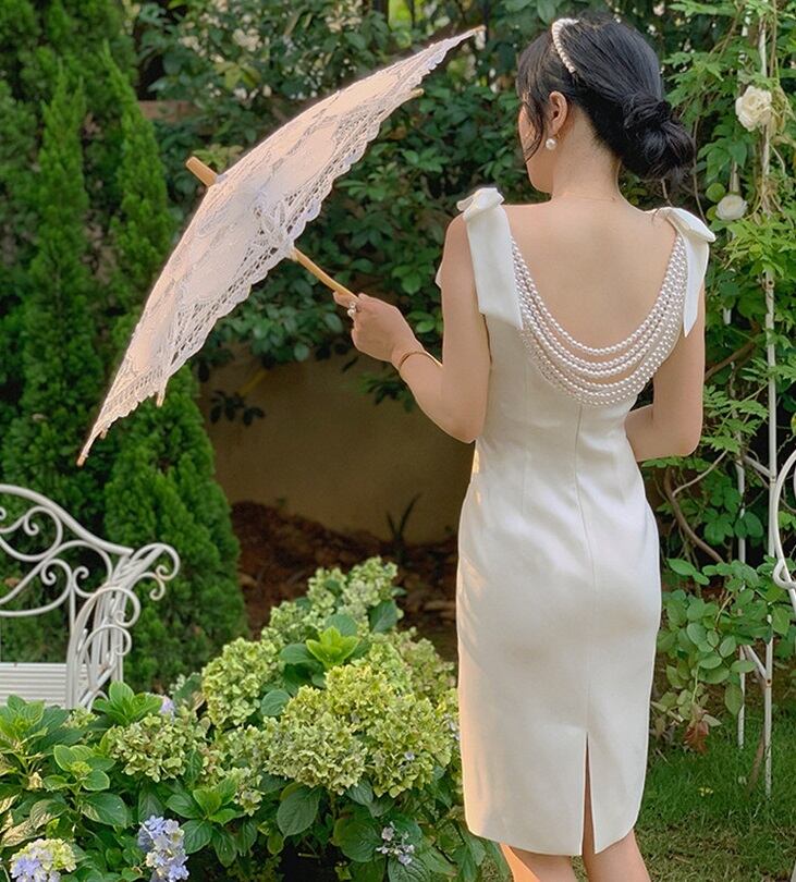 バックのパール飾りと肩のリボンが魅力を引き立せるワンピース。