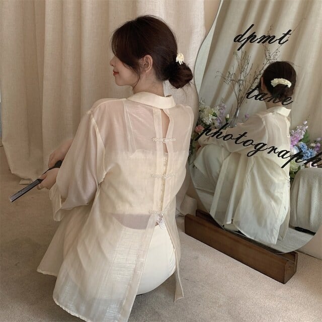 【送料無料】レディース バック パール チャイナボタン シアーシャツ シースルー 長袖 大人可愛い ママコーデ ママファッション 韓国系 オルチャン 人気 トレンド 新作 20代 30代 40代 きれいめ レトロ シンプル お出かけ デート おしゃれ 通勤 通学 オフィス OL デイリー 普段着 ラフ カジュアル フェミニン シック ゆったり 体型カバー 着痩せ 着回し インスタ映え 春 秋 CO4416
