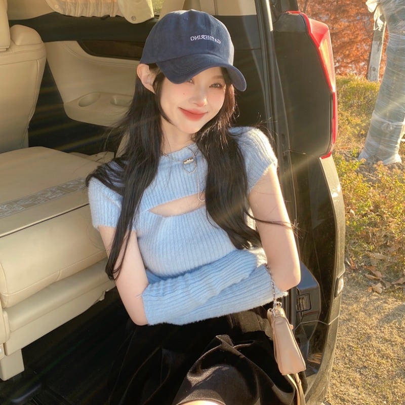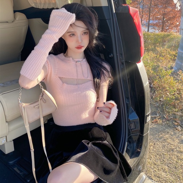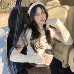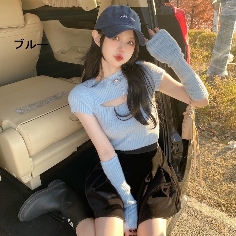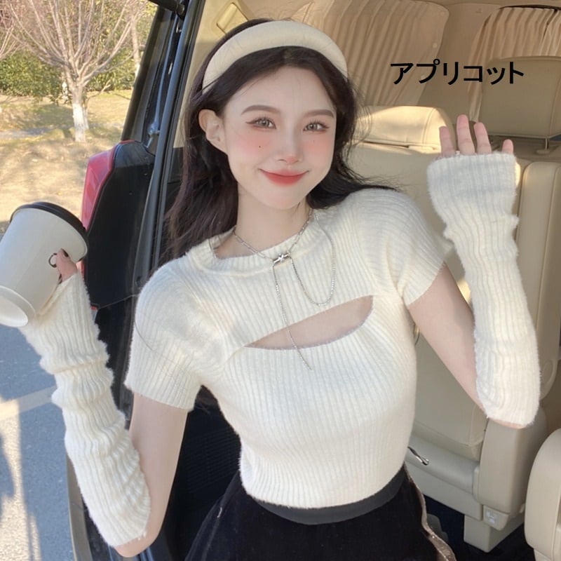 【送料無料】レディース アームカバー付き リブ ニット トップス カットアウト 半袖 胸あき 大人可愛い ママコーデ ママファッション 韓国系 オルチャン 人気 トレンド 新作 20代 30代 40代 きれいめ レトロ シンプル お出かけ デート おしゃれ 通勤 通学 オフィス OL デイリー 普段着 ラフ カジュアル フェミニン シック ゆったり 体型カバー 着痩せ 着回し インスタ映え 春 秋 CO4429