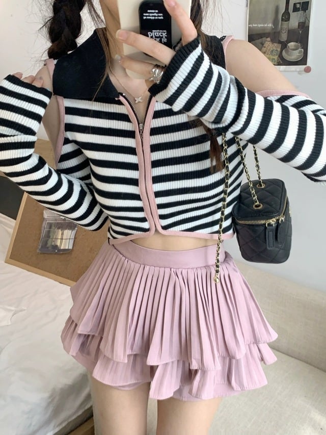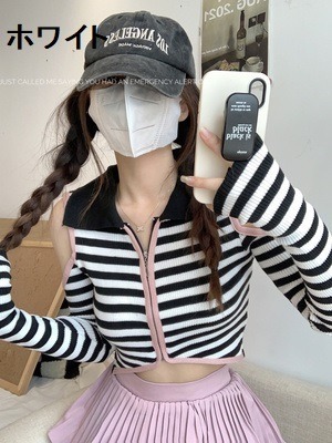 【送料無料】レディース オープンショルダーボーダーカットソー 3色 トップス 襟付き フロントジッパー クロップド丈 長袖 Vネック ボーダー柄 大人可愛い ママコーデ ママファッション 韓国系 オルチャン 人気 トレンド 新作 20代 30代 40代 きれいめ レトロ シンプル お出かけ デート おしゃれ 通勤 通学 オフィス OL デイリー 普段着 ラフ カジュアル フェミニン シック ゆったり 体型カバー 着痩せ 着回し インスタ映え 春 秋 CO4430