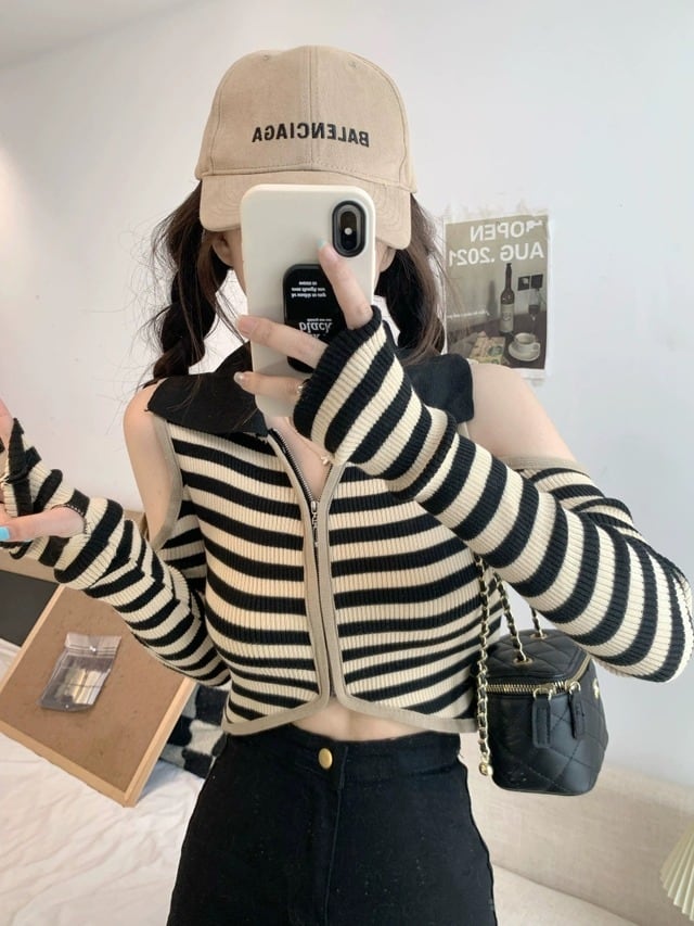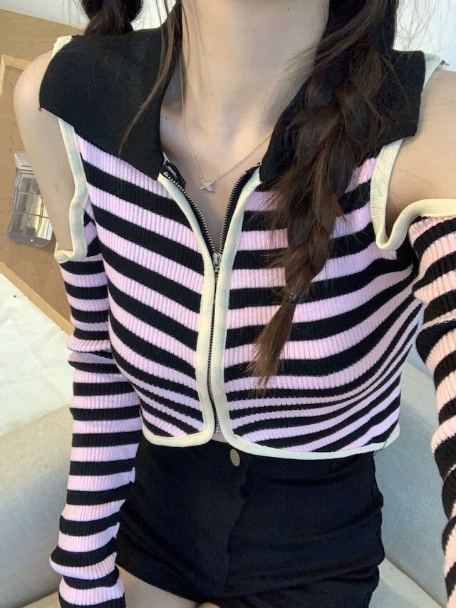 オープンショルダーがセクシーな、ボーダー柄のフロントジップカットソー。