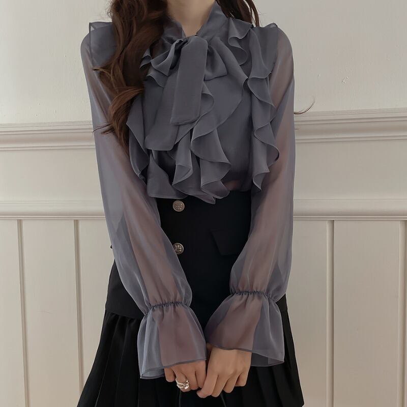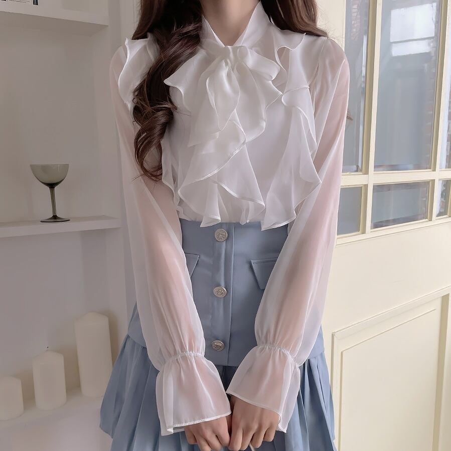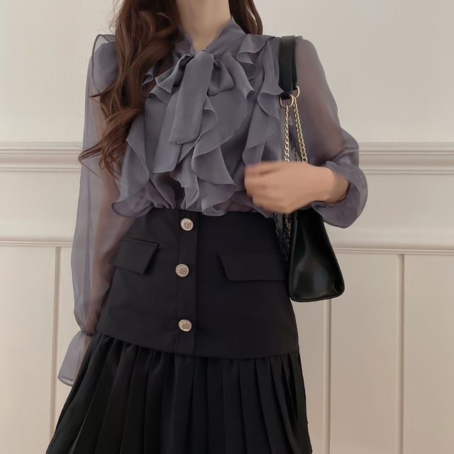 大人の女性らしい上品な雰囲気に仕上げてくれるフリルシアーブラウス。