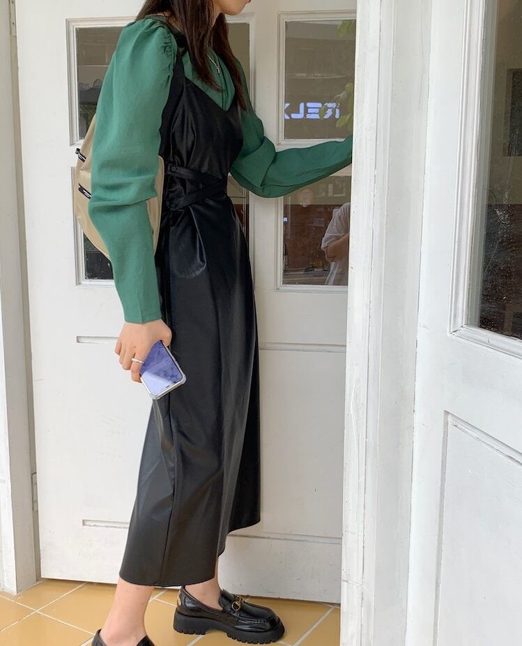パフスリーブのブラウスと、レザークロスストラップワンピースのセットアップ。