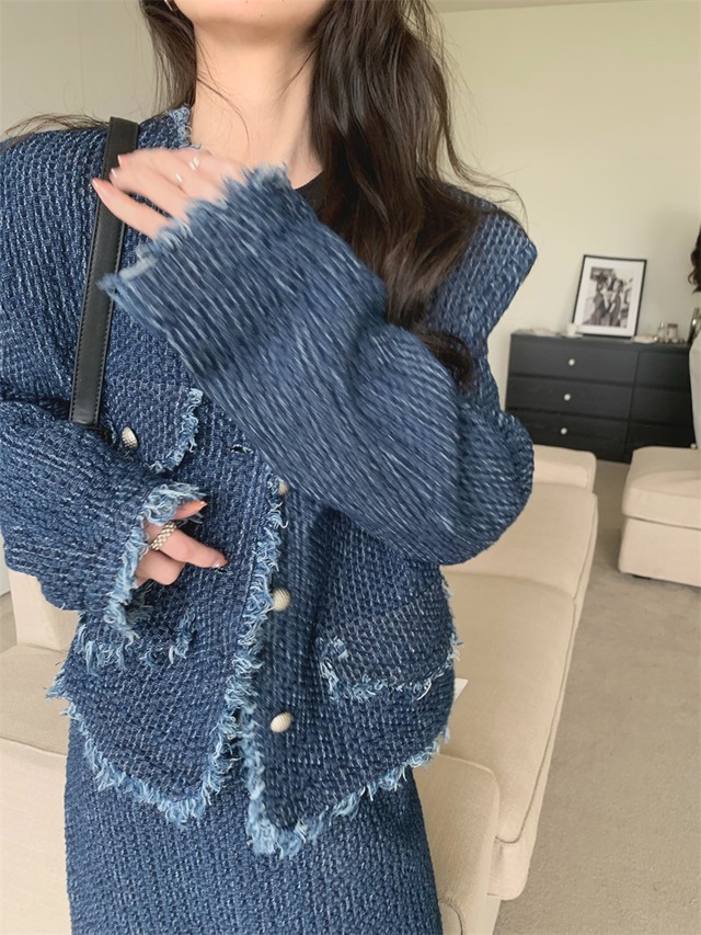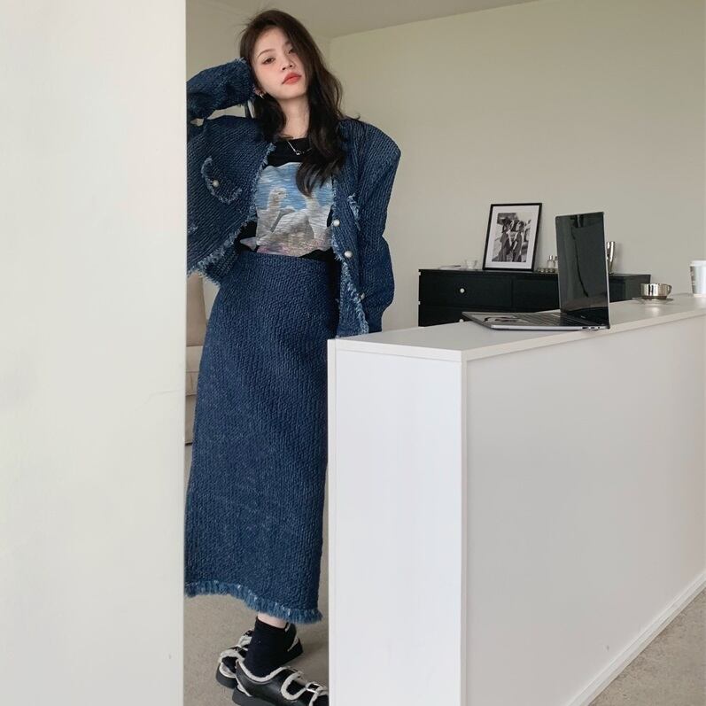 【送料無料】レディース セットアップ ジャケット+スカート 2点セット デニム フリンジ Vネック 長袖 大人可愛い ママコーデ ママファッション 韓国系 オルチャン 人気 トレンド 新作 20代 30代 40代 きれいめ レトロ シンプル お出かけ デート おしゃれ 通勤 通学 オフィス OL デイリー 普段着 ラフ カジュアル フェミニン シック ゆったり 体型カバー 着痩せ 着回し インスタ映え 春 秋 冬 CO4485