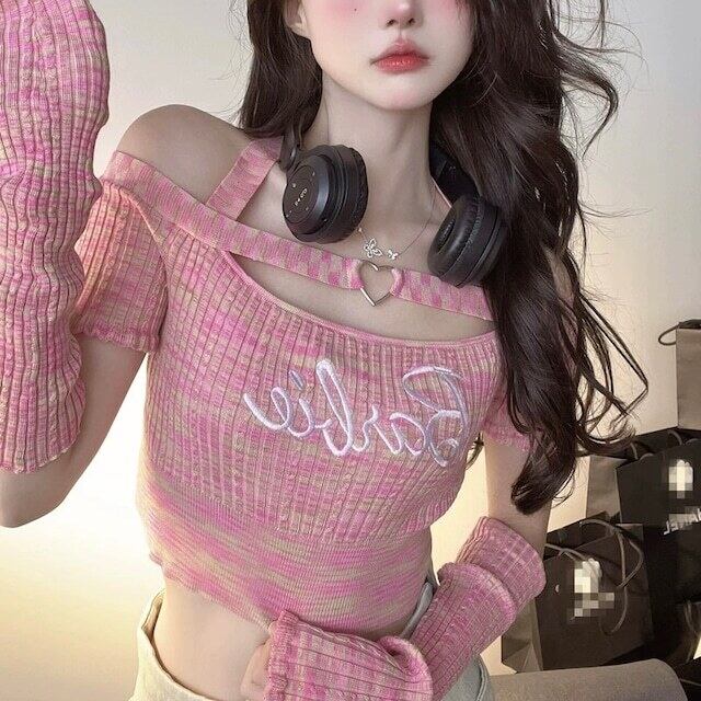 【送料無料】レディース アームウォーマー付き ニットTシャツ ピンク トップス Tシャツ オフショルダー ハート 半袖 クロップド丈 ロゴ セクシー 大人可愛い ママコーデ ママファッション 韓国系 オルチャン 人気 トレンド 新作 20代 30代 40代 きれいめ レトロ シンプル お出かけ デート おしゃれ 通勤 通学 オフィス OL デイリー 普段着 ラフ カジュアル フェミニン シック ゆったり 体型カバー 着痩せ 着回し インスタ映え 春 秋 冬 CO4535