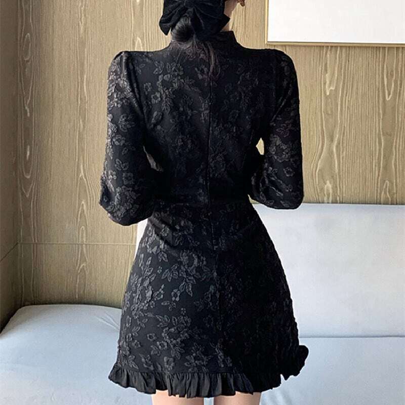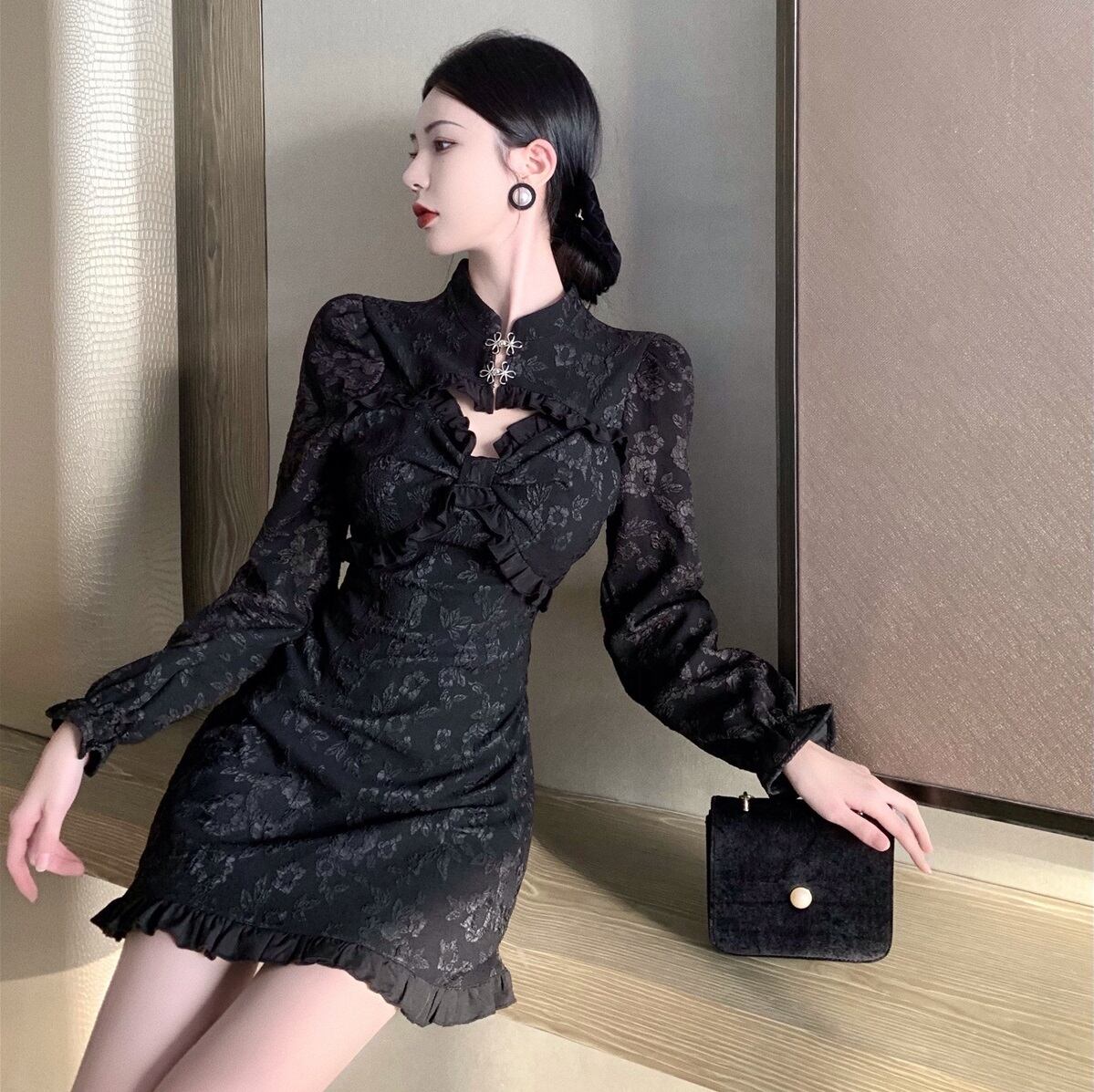 【送料無料】レディース ワンピース チャイナ風 花模様 黒 長袖 ペプラム Aライン チャイナドレス ブラック リボン 胸開き 大人可愛い ママコーデ ママファッション 韓国系 オルチャン 人気 トレンド 新作 20代 30代 40代 きれいめ レトロ シンプル お出かけ デート おしゃれ 通勤 通学 オフィス OL デイリー 普段着 ラフ カジュアル フェミニン シック ゆったり 体型カバー 着痩せ 着回し インスタ映え 春 秋 冬 CO4579