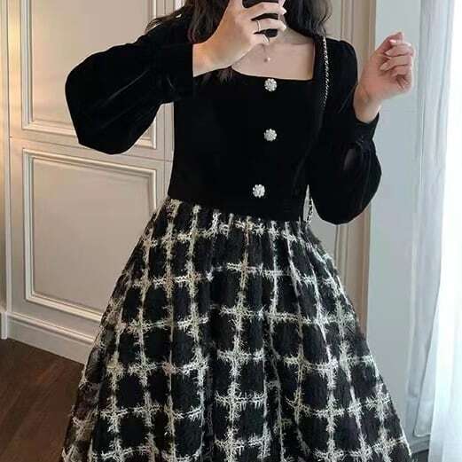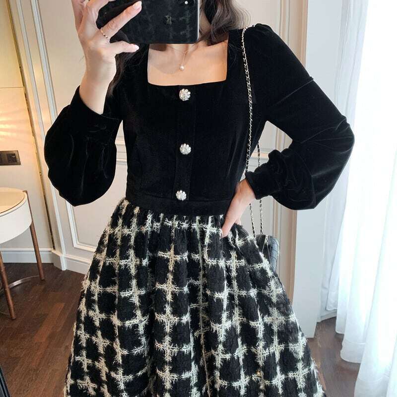 【送料無料】レディース チェック柄 ドッキング ワンピース ドレス スクエアネック ベルベット 長袖 バイカラー お呼ばれ フォーマル パーティー 大人可愛い ママコーデ ママファッション 韓国系 オルチャン 人気 トレンド 新作 20代 30代 40代 きれいめ レトロ シンプル お出かけ デート おしゃれ 通勤 通学 オフィス OL デイリー 普段着 ラフ カジュアル フェミニン シック ゆったり 体型カバー 着痩せ 着回し インスタ映え 春 秋 冬 CO4688
