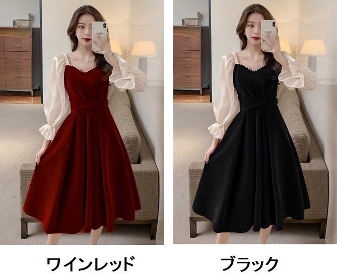 【送料無料】レディース ベルベット ワンピース スクエアネック パール キャンディースリーブ バックリボン フォーマル お呼ばれ パーティー 大人可愛い ママコーデ ママファッション 韓国系 オルチャン 人気 トレンド 新作 20代 30代 40代 きれいめ レトロ シンプル お出かけ デート おしゃれ 通勤 通学 オフィス OL デイリー 普段着 ラフ カジュアル フェミニン シック ゆったり 体型カバー 着痩せ 着回し インスタ映え 春 秋 冬 CO4689