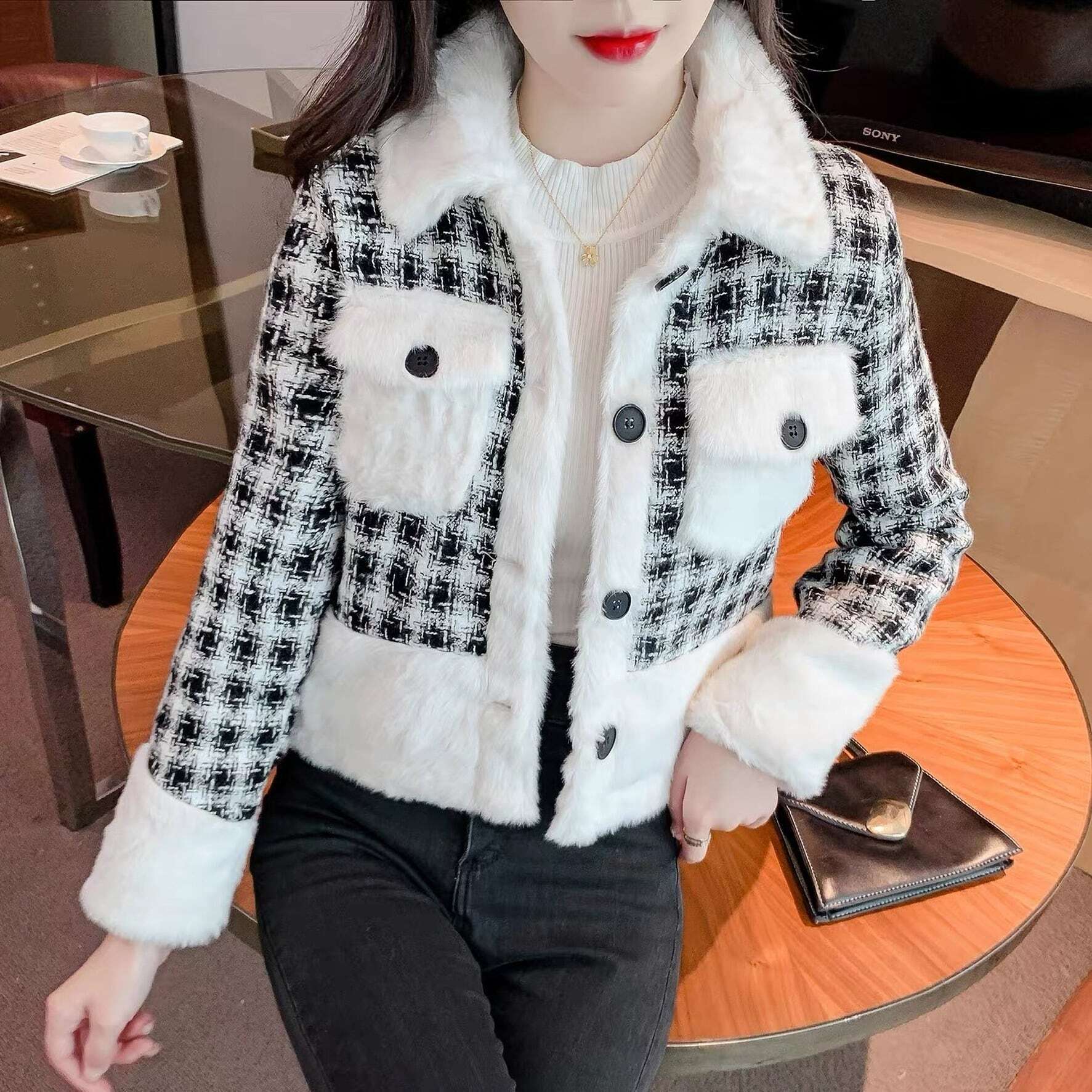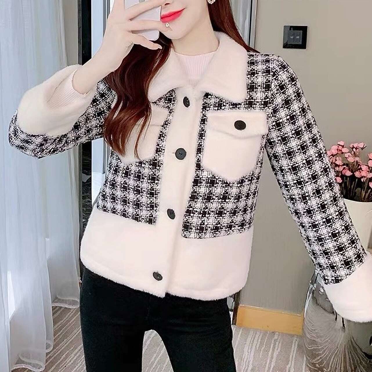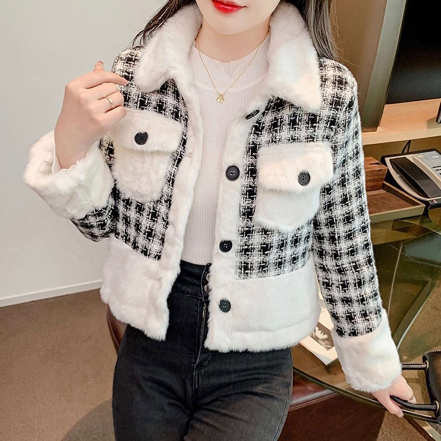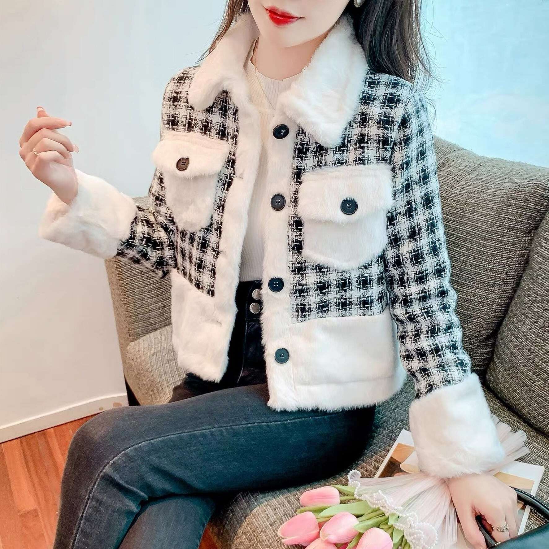 【送料無料】レディース ふわふわ ボア モノトーン ジャケット アウター ツイード ショート丈 チェック 襟付き 長袖 バイカラー ポケット 大人可愛い ママコーデ ママファッション 韓国系 オルチャン 人気 トレンド 新作 20代 30代 40代 きれいめ レトロ シンプル お出かけ デート おしゃれ 通勤 通学 オフィス OL デイリー 普段着 ラフ カジュアル フェミニン シック ゆったり 体型カバー 着痩せ 着回し インスタ映え 春 秋 冬 CO4692