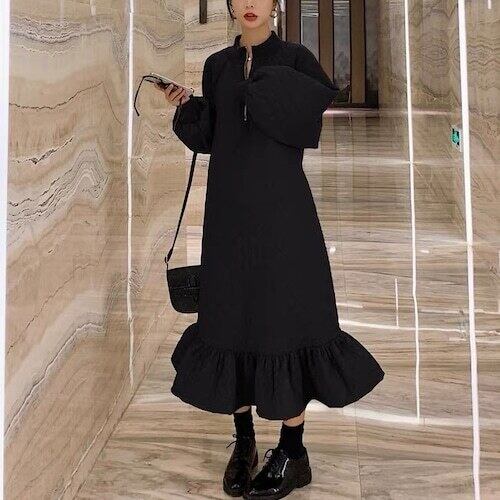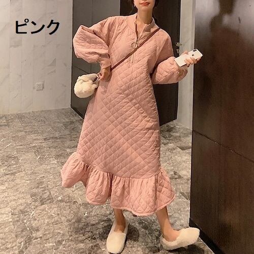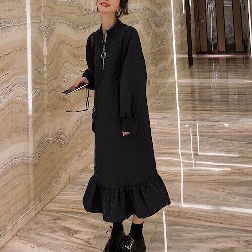 【送料無料】レディース ジップ付き キルティング マーメイド ワンピース フリル Aライン ボリュームスリーブ 長袖 大人可愛い ママコーデ ママファッション 韓国系 オルチャン 人気 トレンド 新作 20代 30代 40代 きれいめ レトロ シンプル お出かけ デート おしゃれ 通勤 通学 オフィス OL デイリー 普段着 ラフ カジュアル フェミニン シック ゆったり 体型カバー 着痩せ 着回し インスタ映え 春 秋 冬 CO4600