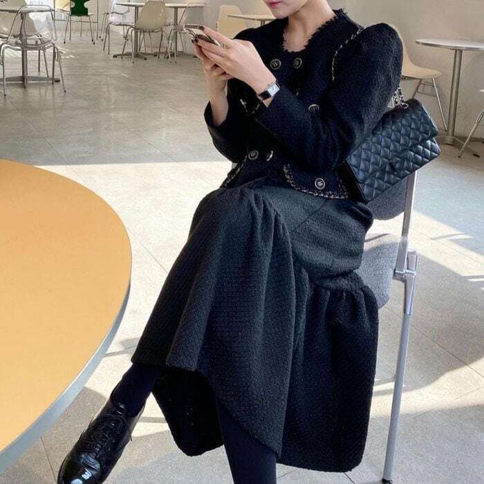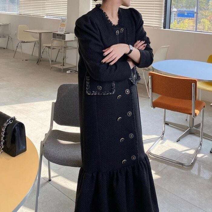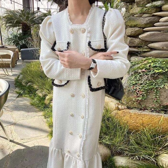 【送料無料】レディース フリルヘム ツイード ワンピース フリンジ 長袖 マーメード ロングワンピース フレアワンピース大人可愛い ママコーデ ママファッション 韓国系 オルチャン 人気 トレンド 新作 20代 30代 40代 きれいめ レトロ シンプル お出かけ デート おしゃれ 通勤 通学 オフィス OL デイリー 普段着 ラフ カジュアル フェミニン シック ゆったり 体型カバー 着痩せ 着回し インスタ映え 春 秋 冬 CO4610