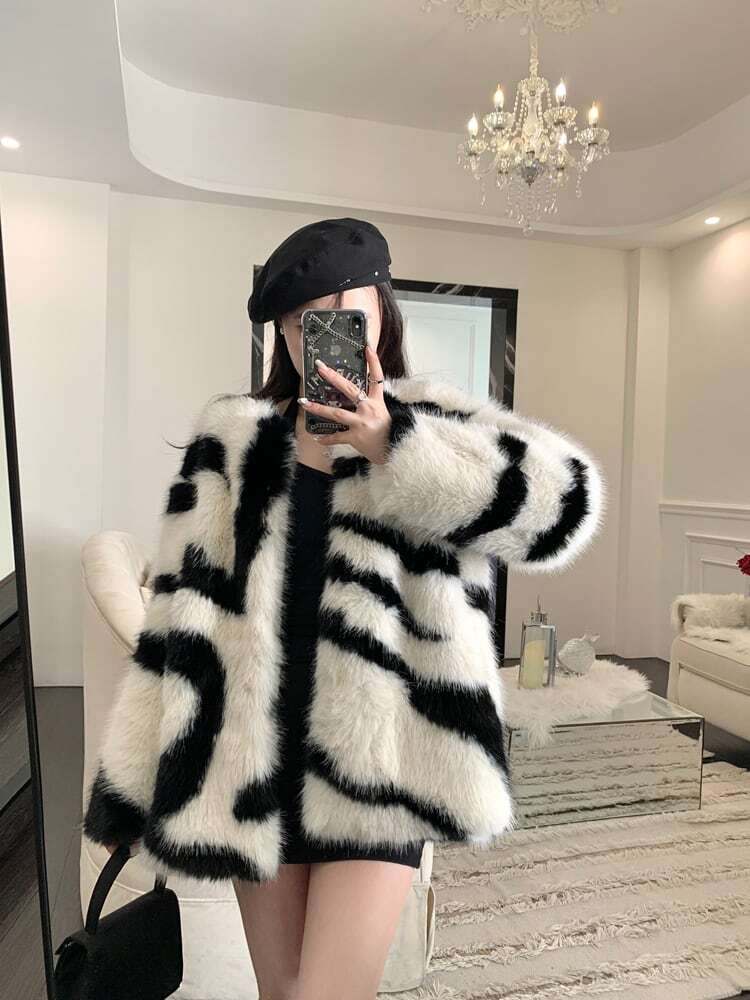 【送料無料】レディース エブラ柄 ラウンドネック ファー コート アウター ジャケット こもこも ふわふわ バイカラー 大人可愛い ママコーデ ママファッション 韓国系 オルチャン 人気 トレンド 新作 20代 30代 40代 きれいめ レトロ シンプル お出かけ デート おしゃれ 通勤 通学 オフィス OL デイリー 普段着 ラフ カジュアル フェミニン シック ゆったり 体型カバー 着痩せ 着回し インスタ映え 春 秋 冬 CO4636
