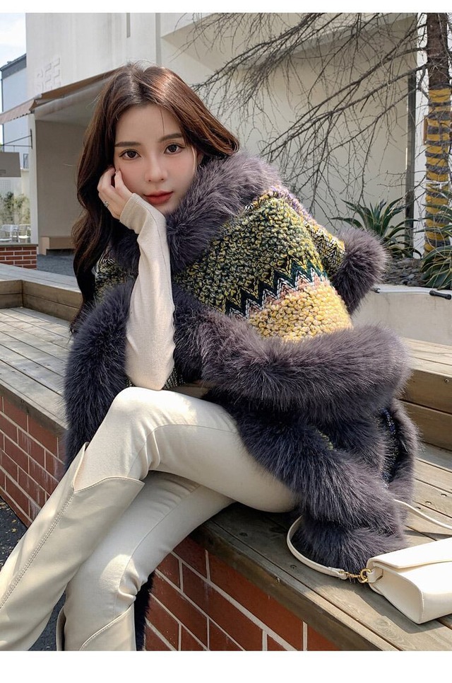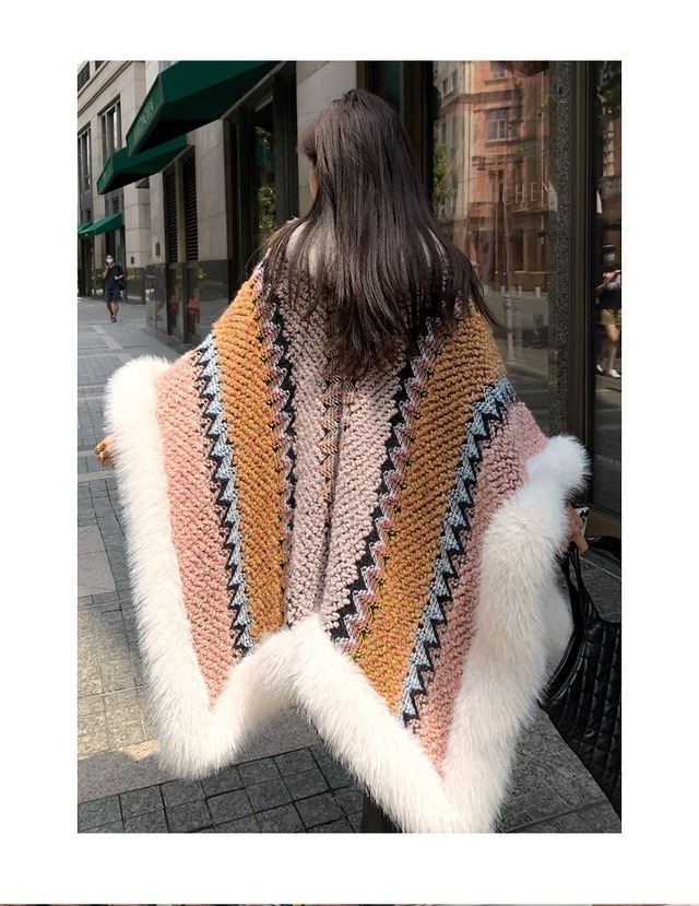 エレガントでファーがゴージャスなエスニック柄暖かポンチョ型アウター。