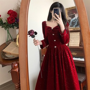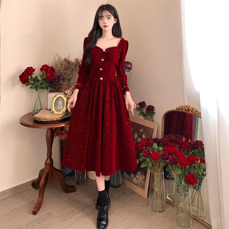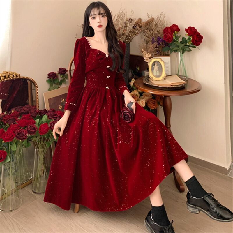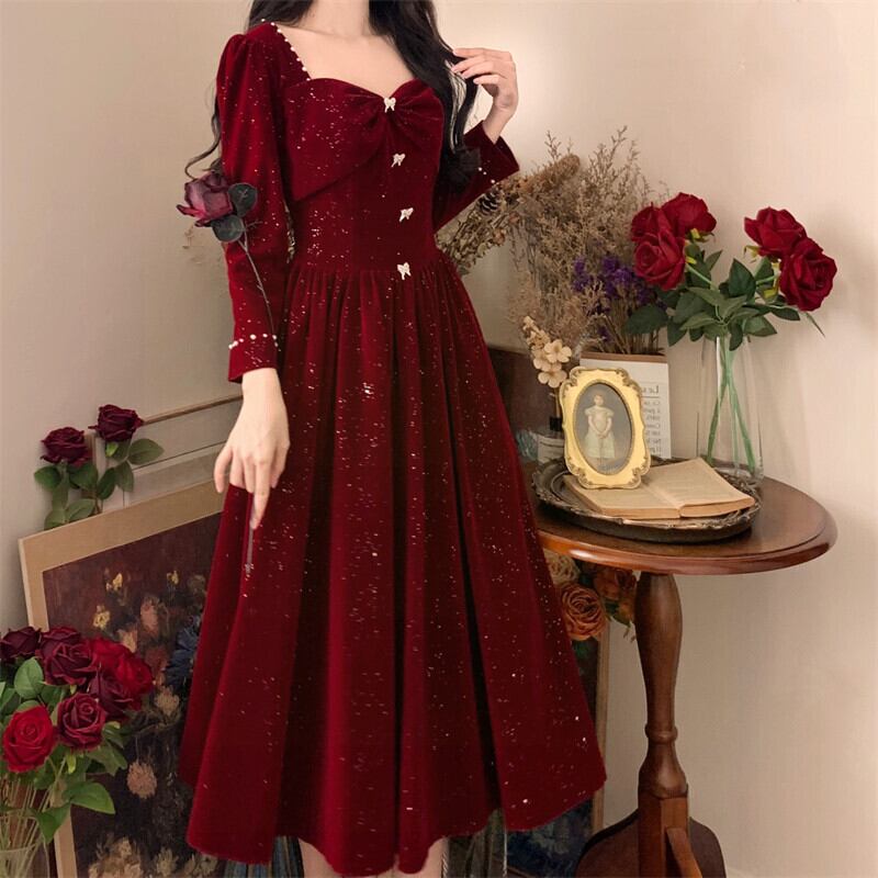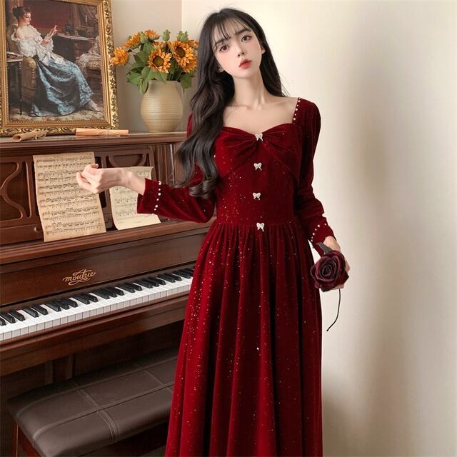 【送料無料】レディース レッド ミディ ドレス ワンピース ベルベット リボン スリーブ スクエアネック Aライン ラメ パーティー お呼ばれ 大きいサイズ 大人可愛い ママコーデ ママファッション 韓国系 オルチャン 人気 トレンド 新作 20代 30代 40代 きれいめ レトロ シンプル お出かけ デート おしゃれ 通勤 通学 オフィス OL デイリー 普段着 ラフ カジュアル フェミニン シック ゆったり 体型カバー 着痩せ 着回し インスタ映え 春 秋 冬 CO4751