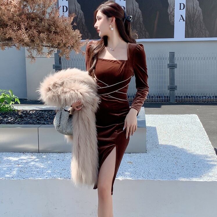 【送料無料】レディース ベルベット ワンピース スクエアネック ウエストクロス スリット タイトワンピース 長袖 お呼ばれ フォーマル パーティー 大人可愛い ママコーデ ママファッション 韓国系 オルチャン 人気 トレンド 新作 20代 30代 40代 きれいめ レトロ シンプル お出かけ デート おしゃれ 通勤 通学 オフィス OL デイリー 普段着 ラフ カジュアル フェミニン シック ゆったり 体型カバー 着痩せ 着回し インスタ映え 春 秋 冬 CO4802