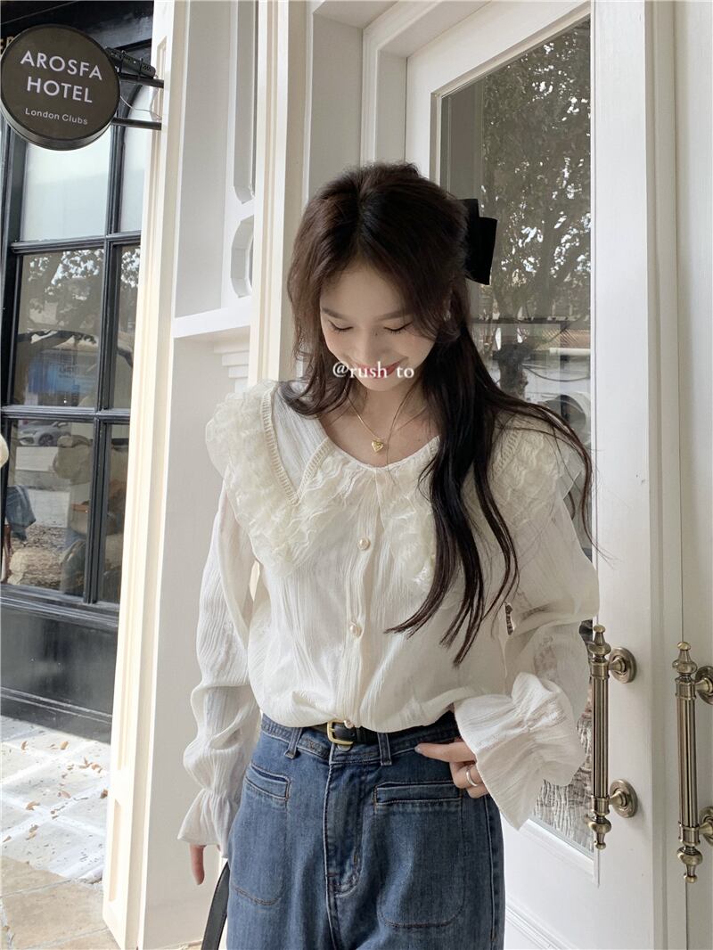 【送料無料】レディース フリル シアー レース ブラウス Vネック パールボタン ビッグカラー ビッグ襟 大きい襟 シャツ 大人可愛い ママコーデ ママファッション 韓国系 オルチャン 人気 トレンド 新作 20代 30代 40代 きれいめ レトロ シンプル お出かけ デート おしゃれ 通勤 通学 オフィス OL デイリー 普段着 ラフ カジュアル フェミニン シック ゆったり 体型カバー 着痩せ 着回し インスタ映え 春 秋 冬 CO4818