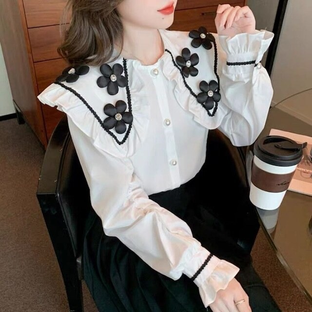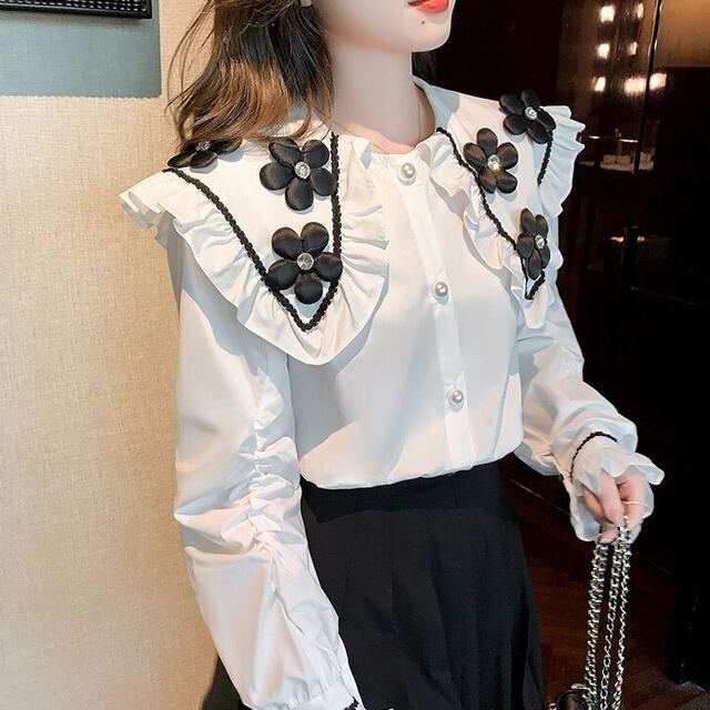 【送料無料】レディース フラワー ビッグカラー ギャザー袖 ブラウス お花付き ブラウス 個性的 花柄 立体 ビッグ襟 大きい襟 フリル 大人可愛い ママコーデ ママファッション 韓国系 オルチャン 人気 トレンド 新作 20代 30代 40代 きれいめ レトロ シンプル お出かけ デート おしゃれ 通勤 通学 オフィス OL デイリー 普段着 ラフ カジュアル フェミニン シック ゆったり 体型カバー 着痩せ 着回し インスタ映え 春 秋 冬 CO4819