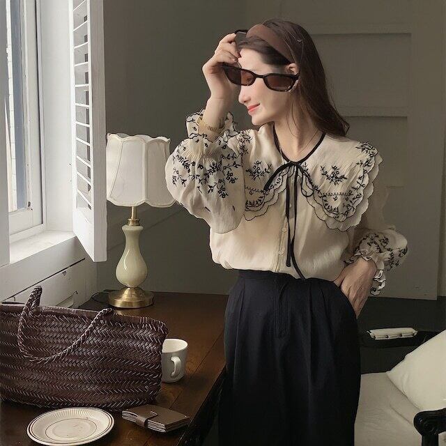 クラシカルで上品な印象のフラワー刺繍ブラウス。