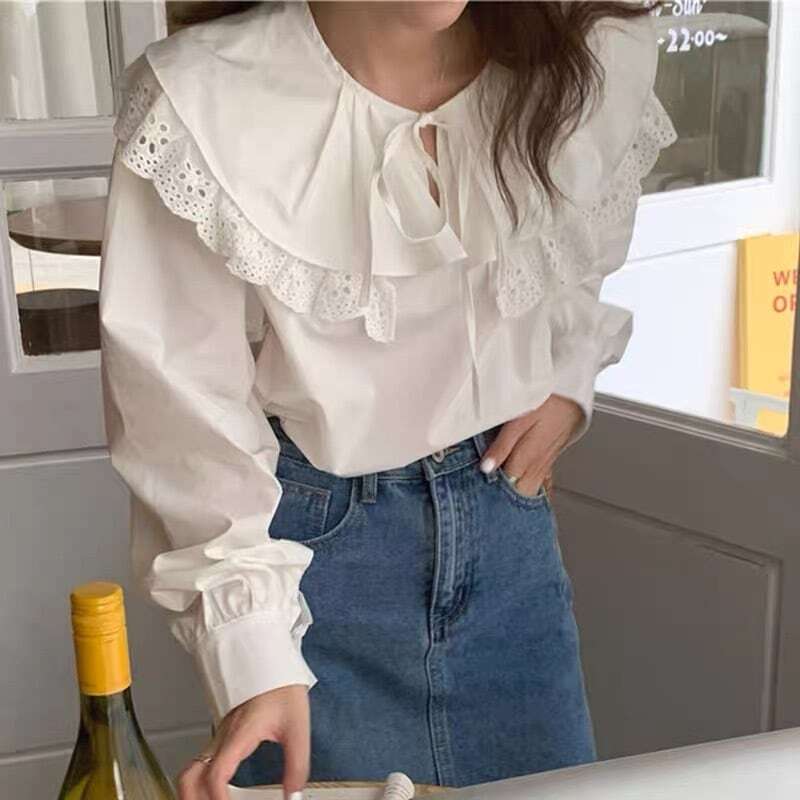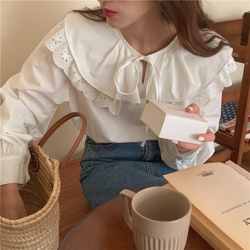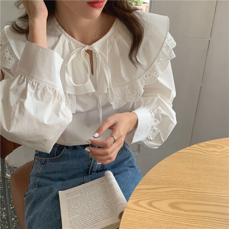 【送料無料】レディース レディース ぽわん袖 ダブルビッグカラー フリル ブラウス リボン スカラップレース ビッグ襟 大きい襟 長袖 大人可愛い ママコーデ ママファッション 韓国系 オルチャン 人気 トレンド 新作 20代 30代 40代 きれいめ レトロ シンプル お出かけ デート おしゃれ 通勤 通学 オフィス OL デイリー 普段着 ラフ カジュアル フェミニン シック ゆったり 体型カバー 着痩せ 着回し インスタ映え 春 秋 冬 CO4825
