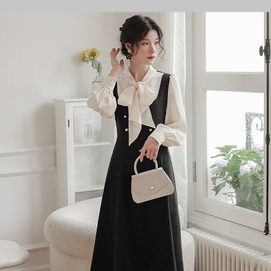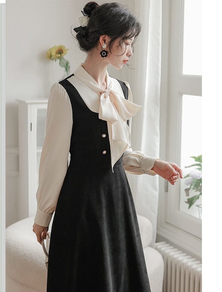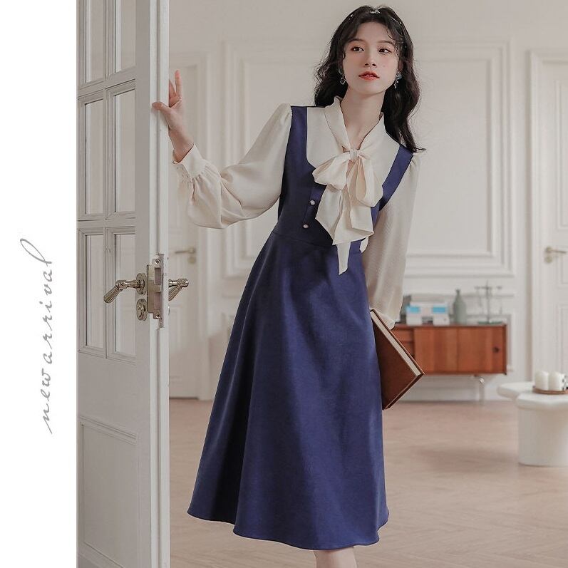 【送料無料】レディース レイヤード風 ワンピース リボンタイ ハイウエスト バックリボン 長袖 パールボタン フォーマル お呼ばれ 大人可愛い ママコーデ ママファッション 韓国系 オルチャン 人気 トレンド 新作 20代 30代 40代 きれいめ レトロ シンプル お出かけ デート おしゃれ 通勤 通学 オフィス OL デイリー 普段着 ラフ カジュアル フェミニン シック ゆったり 体型カバー 着痩せ 着回し インスタ映え 春 秋 冬 CO4834