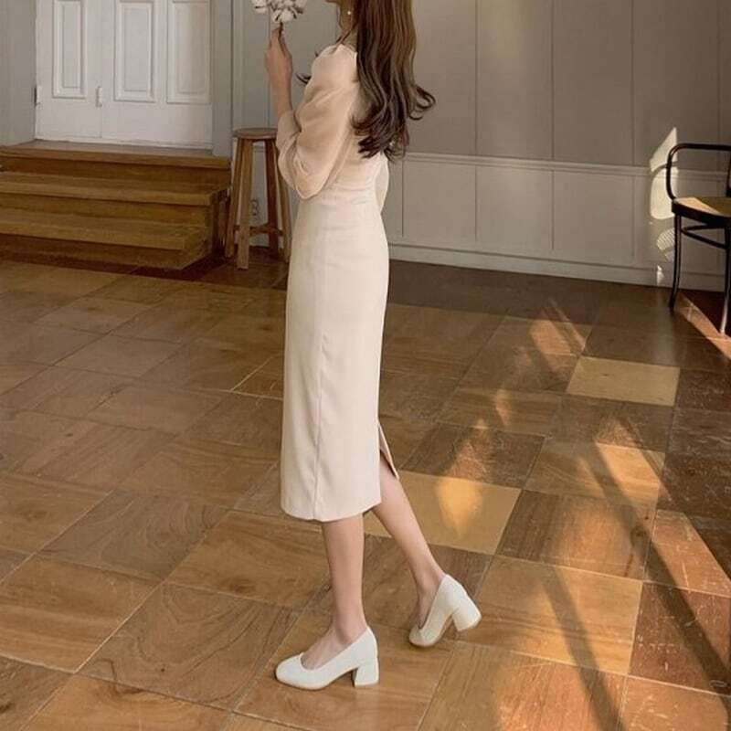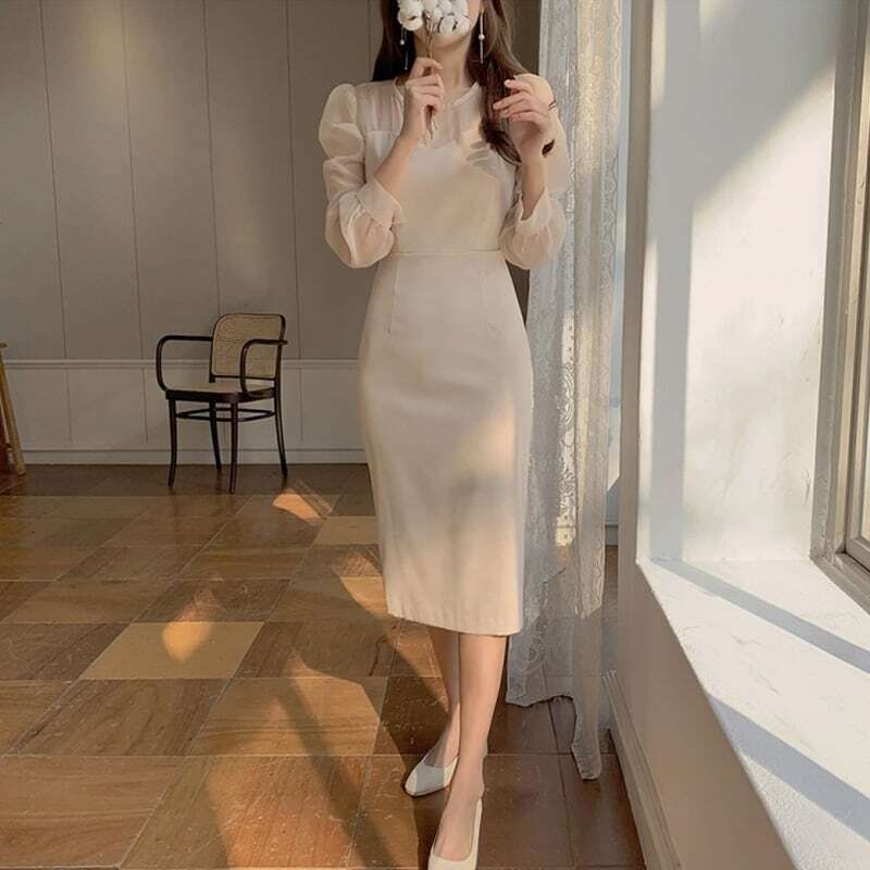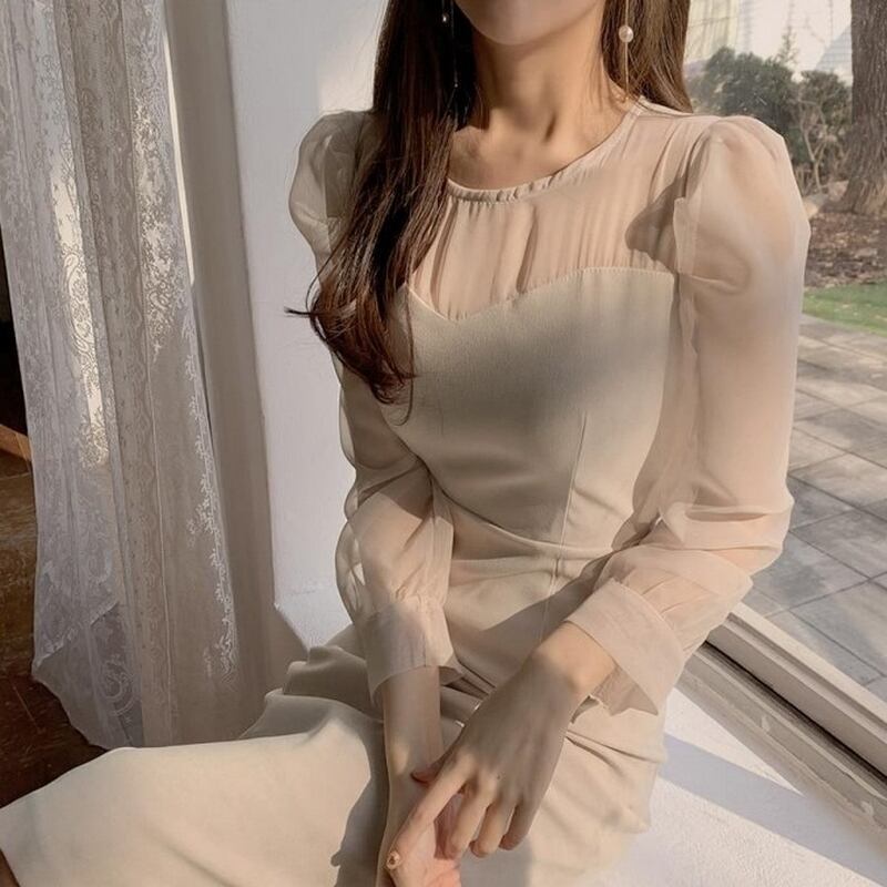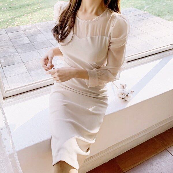 【送料無料】レディース ワンピース Iラインドレス シースルー 透け感 ハートカット クルーネック ボリューム袖 長袖 フォーマル お呼ばれ パーティー 大人可愛い ママコーデ ママファッション 韓国系 オルチャン 人気 トレンド 新作 20代 30代 40代 きれいめ レトロ シンプル お出かけ デート おしゃれ 通勤 通学 オフィス OL デイリー 普段着 ラフ カジュアル フェミニン シック ゆったり 体型カバー 着痩せ 着回し インスタ映え 春 秋 冬 CO4846