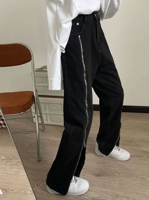 裾まで大胆なファスナーが個性的で他と差をつけられるロングパンツ。