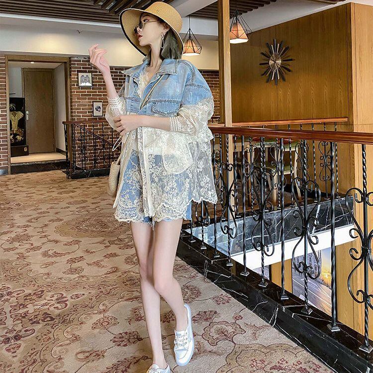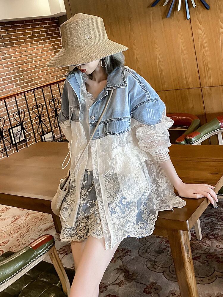 【送料無料】レディース デニムジャケット デニム ジャケット Gジャン レース 透け感 アウター 半袖 襟付き ポロカラー ボタン 前開き ポケット ルーズ 大人可愛い ママコーデ ママファッション 韓国系 オルチャン 人気 トレンド 新作 20代 30代 40代 きれいめ レトロ シンプル お出かけ デート おしゃれ 通勤 通学 オフィス OL デイリー 普段着 ラフ カジュアル フェミニン シック ゆったり 体型カバー 着痩せ 着回し インスタ映え 春 夏 CO4917