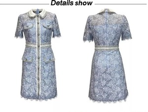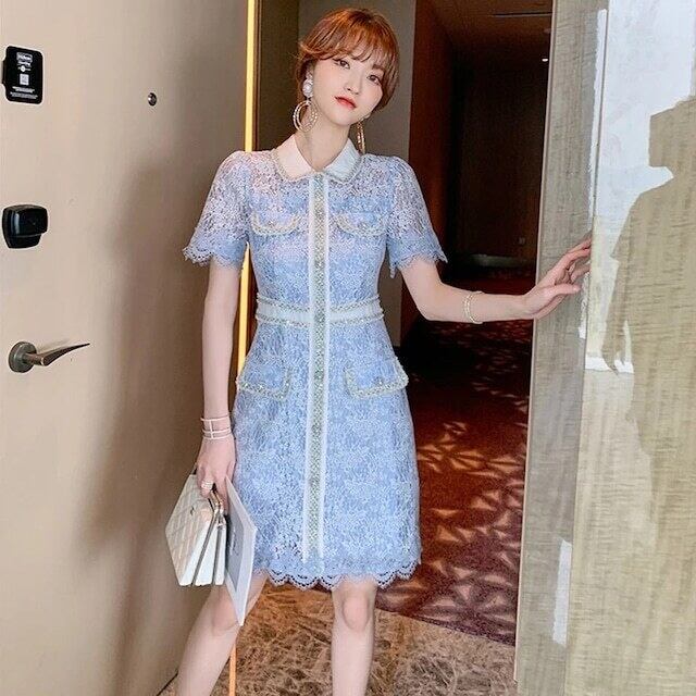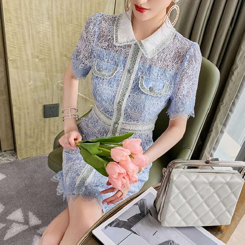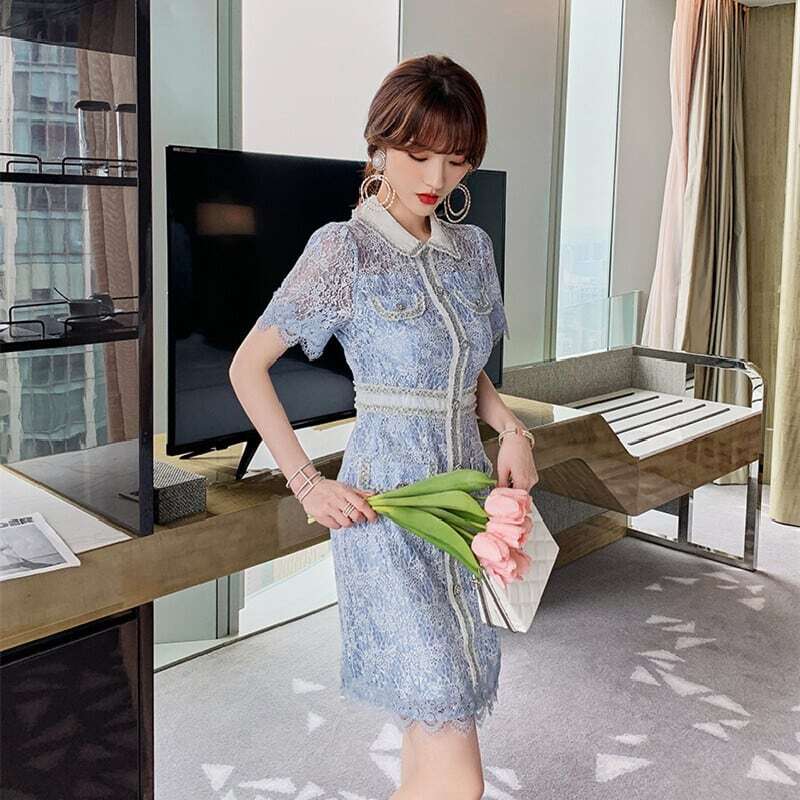 【送料無料】レディース ワンピース ドレス レース 襟付き 水色 エレガント POLOネック 半袖 ブルー 大人可愛い ママコーデ ママファッション 韓国系 オルチャン 人気 トレンド 新作 20代 30代 40代 きれいめ レトロ シンプル お出かけ デート おしゃれ 通勤 通学 オフィス OL デイリー 普段着 ラフ カジュアル フェミニン シック ゆったり 体型カバー 着痩せ 着回し インスタ映え 春 夏 秋 CO5009