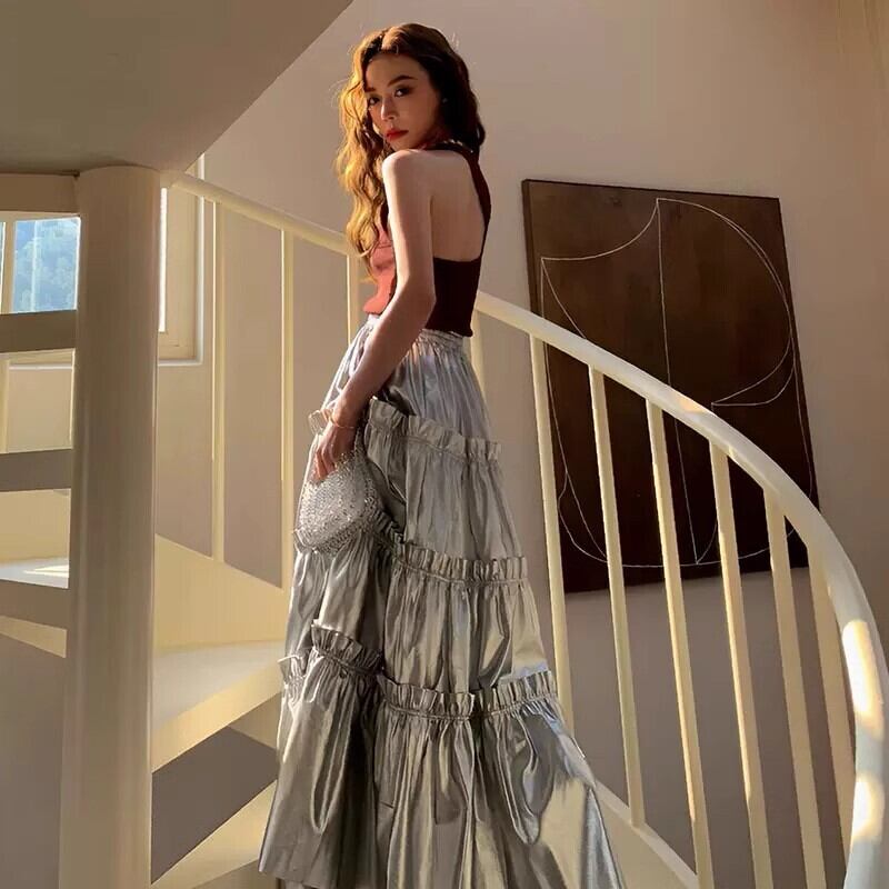 スカート レディース メタリックケーキ フリル メタリック ロングスカート ティアード 光沢感 脚長 美脚 スタイルアップ マキシ丈 ロング丈 Aライン シルバー 大人可愛い ママコーデ 韓国 オルチャン 人気 トレンド 新作 20代 30代 40代 きれいめ レトロ シンプル お出かけ デート おしゃれ 通勤 通学 オフィス OL デイリー 普段着 ラフ カジュアル フェミニン シック ゆったり 体型カバー 着痩せ 着回し インスタ映え 春 秋 冬 CO5068