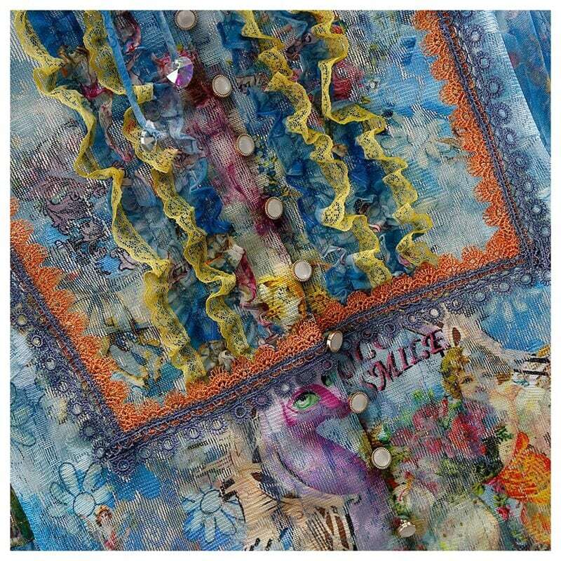 ゴージャスな総柄プリントが魅力的なレースブラウス。