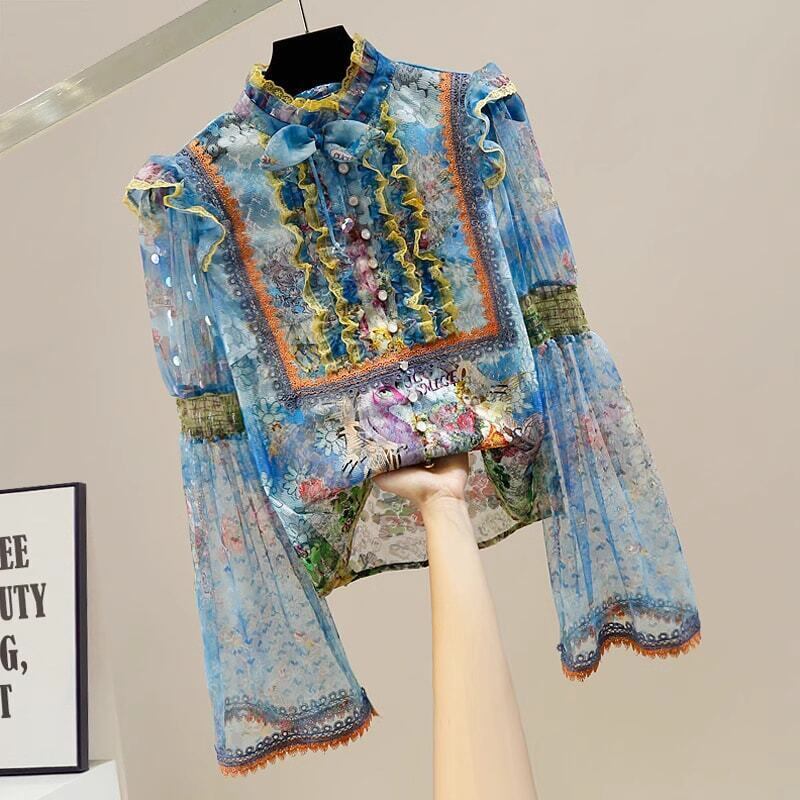 ブラウス レディース ロイヤルプリント レースブラウス ハイネック フリル シースルー 透け感 カラフル トランペットスリーブ ドット 水玉 長袖 大人可愛い ママコーデ 韓国 オルチャン 人気 トレンド 新作 20代 30代 40代 きれいめ レトロ シンプル お出かけ デート おしゃれ 通勤 通学 オフィス OL デイリー 普段着 ラフ カジュアル フェミニン シック ゆったり 体型カバー 着痩せ 着回し インスタ映え 春 秋 冬 CO5191