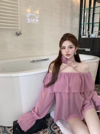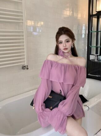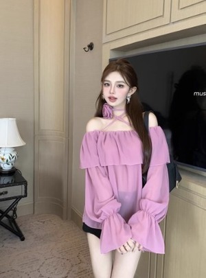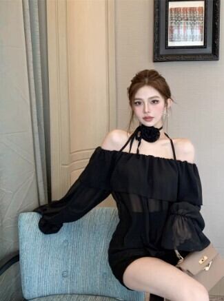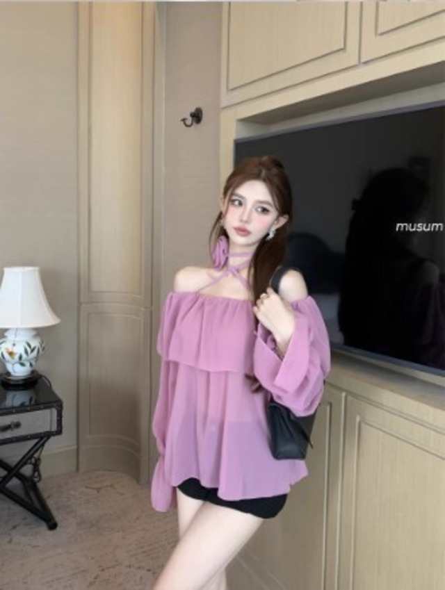 トップス レディース 全2色 フラワーブローチホルターネックオフショルブラウス シフォン 透け感 トランペットスリーブ 大人可愛い 韓国 人気 トレンド 新作 20代 30代 40代 きれいめ レトロ シンプル お出かけ デート おしゃれ デイリー 普段着 フェミニン シック 体型カバー 着痩せ 着回し春 夏 CO5259