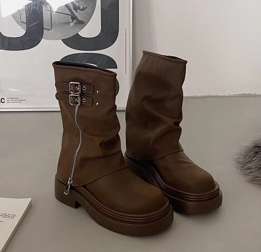 ♡2color バックルベルト厚底ミドルブーツ ファスナー付きカバー風♡